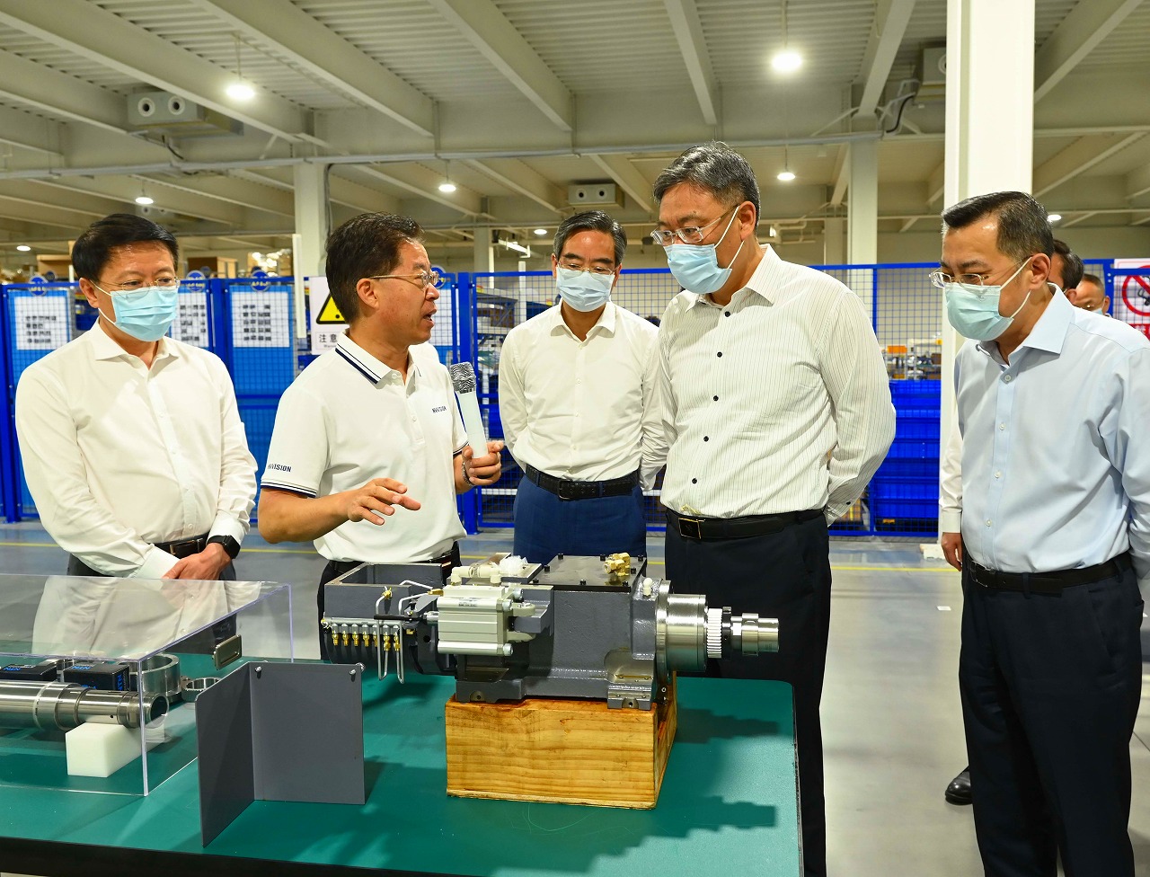 王文濤詳細聽取了山東新景集團董事長、西鐵城(中國)精密機械有限公司董事總經理楊冰對產業園生產經營、產品研發、市場開拓等情況的介紹,參觀了方案中心及生產車間并給予充分肯定。王文濤指出工業母機是國家基礎制造能力的綜合體現,特別是高檔數控機床,其技術水平代表了國家工業化的水平,西鐵城新景高端裝備智能制造產業園的優勢要形成模式大力推廣,確保產業鏈供應鏈暢通,強化產業鏈協同創新,切實把制造業做大做優做強。