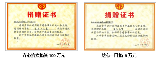 2022年3月,周村疫情嚴峻,企業(yè)快速作出反應,齊心抗疫,第一時間向周村慈善總會捐款 100 萬元,體現(xiàn)企業(yè)的責任和擔當。疫情期間,公司各級領導員工同吃同住在公司,保證大家的生活和公司運營,為奪取疫情防控和實現(xiàn)社會責任發(fā)展雙勝利做出了不可磨滅的貢獻。