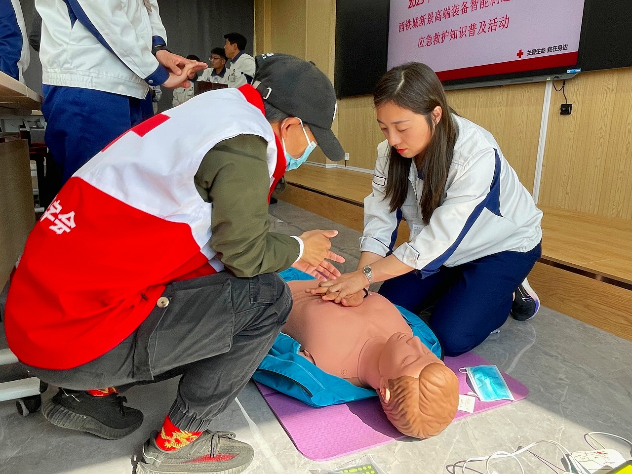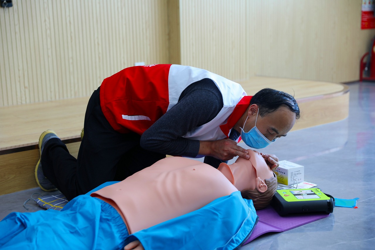 培訓中,授課老師通過理論和實操相結合的方式,詳細講解了心肺復蘇術急救法的應用背景和操作流程,對“AED體外除顫儀”使用的原理、目的、適應癥、禁忌癥、操作規(guī)范、注意事項等方面進行了解釋說明,并利用人體模型進行了“AED體外除顫儀”的操作演示。