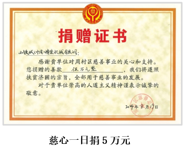 2024年8月份慈心一日捐,公司捐款5萬元,同年11月份再捐款3千元教育慈善基金,共計捐贈5.3萬元。提升奉獻意識,弘揚社會正能量,營造了“人人關心慈善、人人支持慈善、人人參與慈善”的良好氛圍。獲得了當地政府的多次好評,并榮獲“尊師重教先進單位”榮譽稱號。